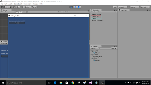 Editor의 실행버튼을 눌러 1개는 LAN HOST, 1개는 LAN Client 를 눌러 2개의 클라이언트가 접속한것을 확인한다.